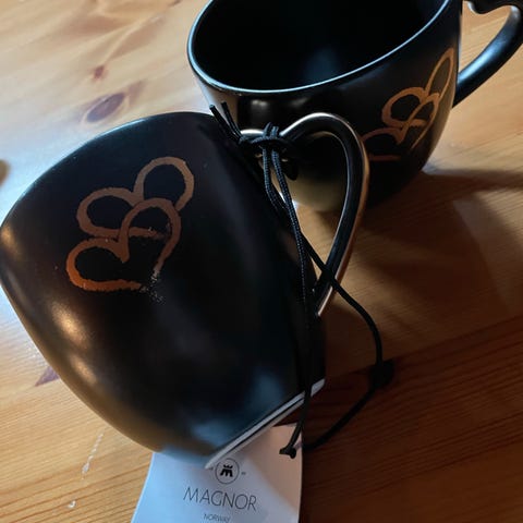Håndtaket på den ene koppen er sprukket, men ikke synlig. Derfor selges de billig sammen.