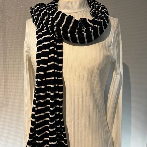Selger et ubrukt skjerf fra Cubus. Skjerfet er svart og hvitt med et tradisjonelt mønster og frynser i endene. Det er hovedsakelig sort på fremsiden og hvitt på baksiden. Skjerfet er ca. 21 cm bredt og ca. 240 cm langt. Det selges ettersom det aldri har blitt brukt.