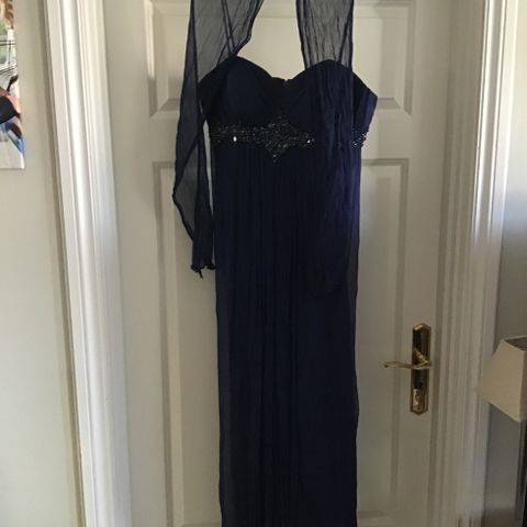 Rustrød lang kjole med treperler rundt halsen, str S, 36/38