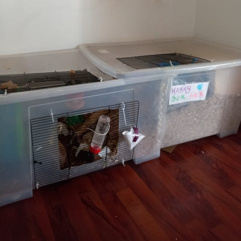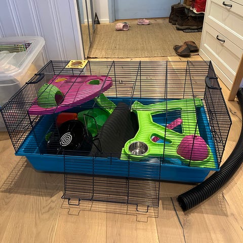 Helt nytt og ubrukt utstyr fra happyhamstery.com (bestilt dobbelt ved en feil). Inneholder en lastebil i tre, et keramisk skjell og et lite feiebrett til rydding av bur.