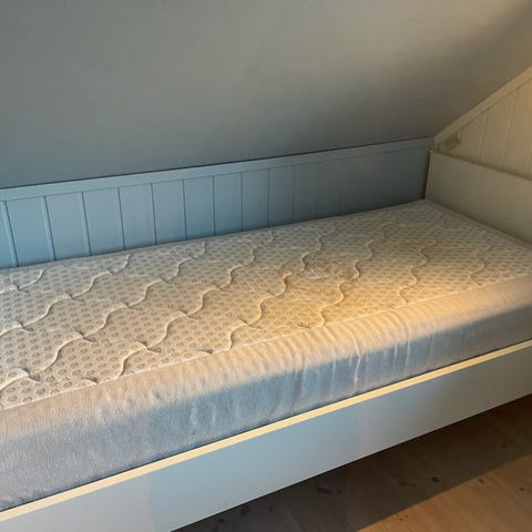 Gir bort en brukt enkelseng med trebein. Sengen er i grei stand og gives bort fordi den ikke lenger er i bruk. Perfekt som gjesteseng, hytteseng eller studentmøbel.