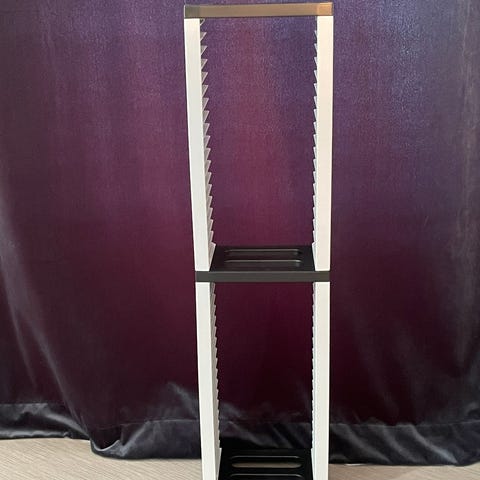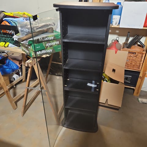 Hyllen ble brukt på The Gathering 2019 (https://www.tg.no/), topprommet er låsbart med skjøteledning. Kabelføring mellom låsbart rom og åpent rom. Det er montert hjul på toppen for enklere transport.