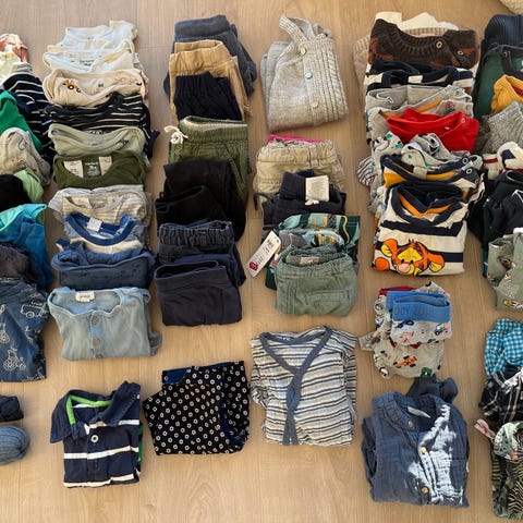 2 ullbodyer, 3 bomullsbodyer, gensere, bukser, skjorte i flanell og tskjorter. Mesteparten i god stand, få av bodyene er godt brukt.