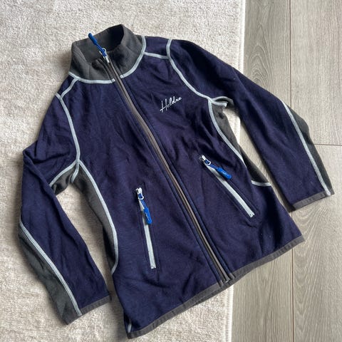 Blå fleecejakke, lommer med glidelås. Størrelse 122/128.
