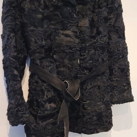 Unik lang EKTE PELS JAKKE sydd av lammeskinn; karakulfår/persianer. One of a kind!