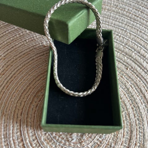 Et vakkert, ubrukt, armbånd med Karma symbol selges. Sterling sølv og grå reimer med strammelås. Pen gavekonvolutt følger med. Porto kr.40 Kan ikke bruke Fiks Ferdig pga. låst postkasse. Send mld. på Finn; jeg svarer med Vipps nr. Gavetips bestevenn - kjæreste.