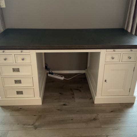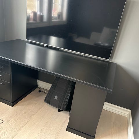 Bordplata er hel og framstår som ny. Bordet har vært ett av to skrivebord jeg har hatt på mitt hjemmekontor, dette bordet har fungert som gjesteplass og er derfor minimalt brukt.