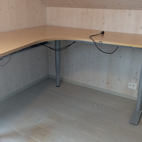 Et høykvalitets skrivebord i bøk fra finske Martela. Bredde 191 cm, dybde 84 og 121 cm. Høyden har jeg satt til 73 cm, denne kan selvfølgelig justeres etter behov. Bordet har tre solide T-bein montert i en ramme og gjør det hele solid og lett å manøvrere seg sideveis når man jobber eller vil ha plass til en skuffeseksjon. Under bordplata er det et opphengshylle for en konvensjonell PC for den som trenger det. Dette er skrivebordet for den som ønsker en god og romslig arbeidsplass.