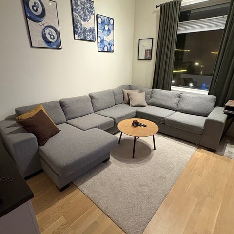 En hjørnesofa dybde 100cm,høyde 70cm, Bredde 300cm/ pris 4000kr