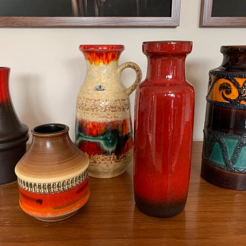 To vintage vaser glasert leirgods, med klassisk vulkansk "Fat lava" dryppglasur. Fra Bay Keramik, Vest-Tyskland. 1970-tall.