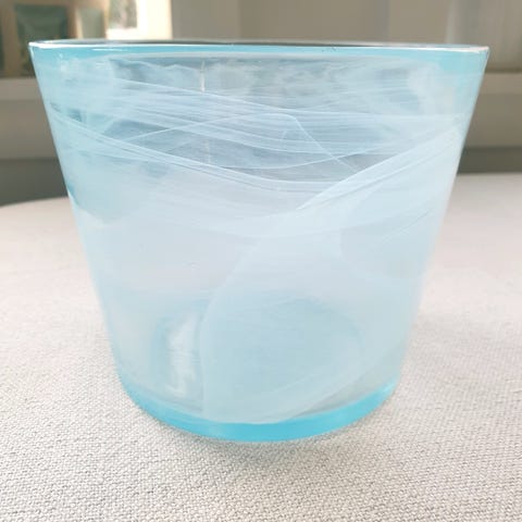 Moderne uttrykk. Nydelig utformet i melkehvitt glass med innslag av litt fargesplash.