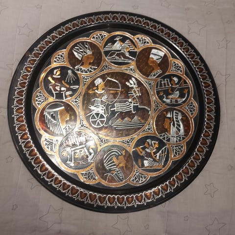 Håndlaget fat med mange fine detaljer til å henge på vegg. Ø 29 cm