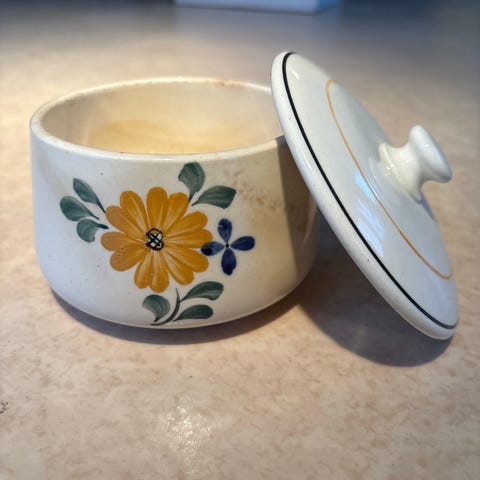 Selger en vakker vintage / gammel smørbutt laget i porselen for kr 150,- Den er i god stand og har ingen skår og ingen nag og ingen krakkelering .