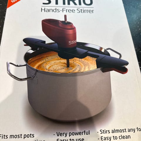 Jeg selger en Saki automatisk gryterører som kun har blitt brukt én gang. Den fungerer perfekt og er ideell for å røre i gryter uten at du trenger å være til stede hele tiden.