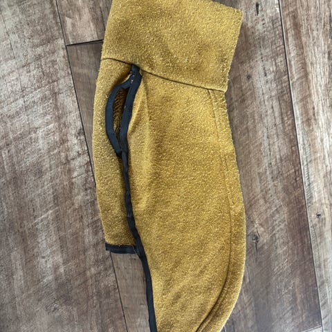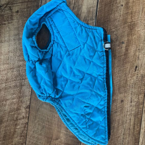 Dekken til liten hund i gull, og med feste til leiebånd. Jeg kan sende for 69,-
