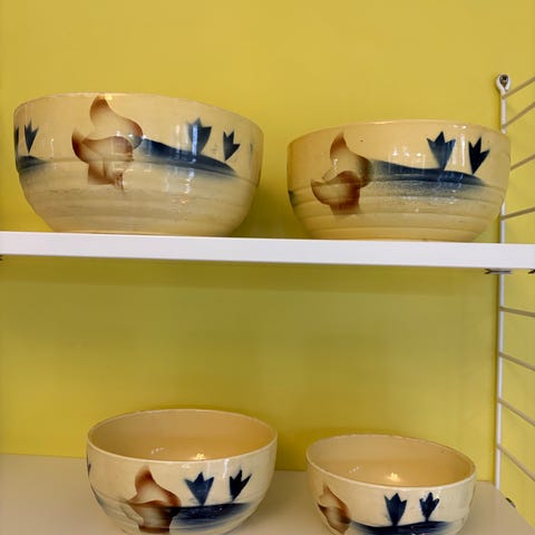 Selger to keramikkboller fra 50-tallet. Den ene er fra Elle keramikk, den andre er Figgjo flint. Begge har en diameter på 16, 17cm. Ingen skader.