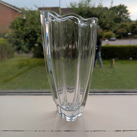 Vi har fått inn for salg en glass vase. H 17 B 16 cm.