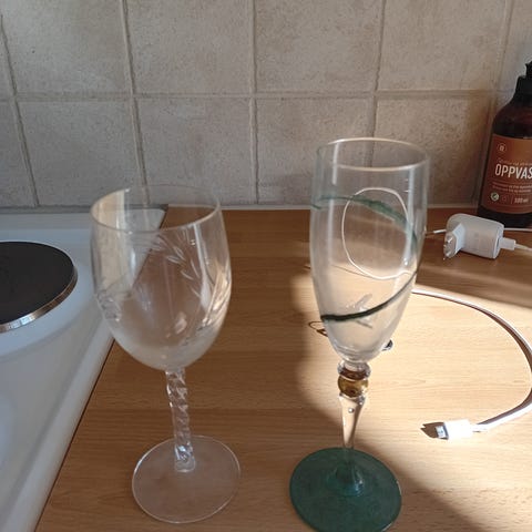 Vi har fått inn for salg et rosa glass. H 17 Ø 8,4 cm.