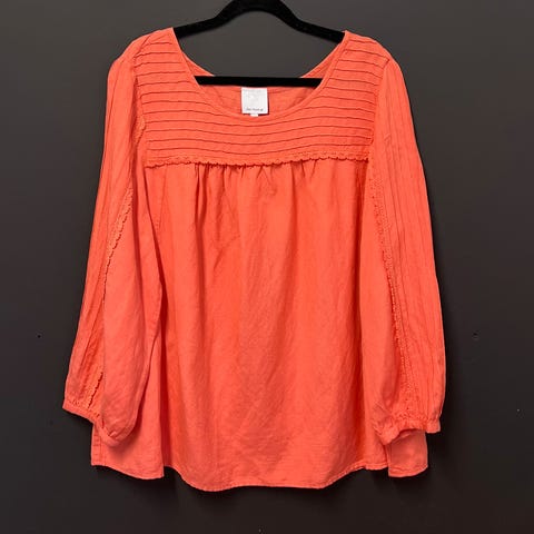 Lekker cyklamenrosa linbluse med skjortepreg selges. Blusen har en feminin fasong, den har innsnitt ved bysten og langsgående innsnitt foran og bak, og v-hals og rysh rundt halskanten.