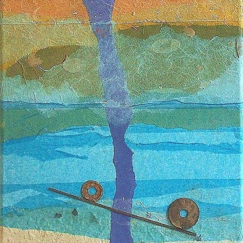 Tre collager av silke- og bomullspapir med applikasjoner på linlerret . Bildene kan henge hver for seg, men har lik størrelse og er derfor også fine sammensatte. Format: 40x40cm. Kan sendes. Kr.650