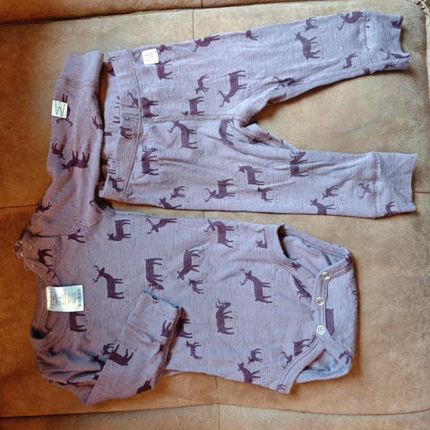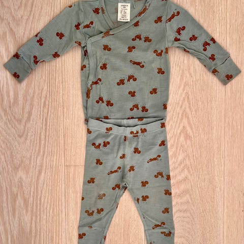 Body og bukse i ull fra Lindex. Body i str 63 og bukse i str 68. Body har to eder med knapper på body slik at den kan brukes lenge. Armer kan brettes opp og ned, det samme med buksa.