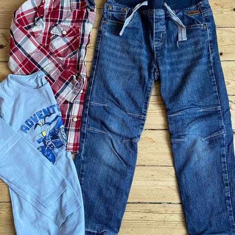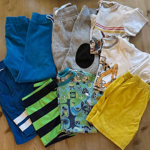 PP Marshall sokker, H&M kortermet T-skjorte, YOU classic collection T-skjorte 4/6 , lupilu bomulls bukse 110/116 ( lite hull på kneet) og en Name it bukse 110.