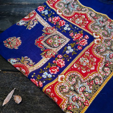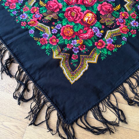 Stort ullsjal med nydelig motiv på sort bunn. 145x145cm. Lite og pent brukt, ingen skader eller bruksmerker. Unikt sjal som er kjøpt på reise i Russland for flere år siden.