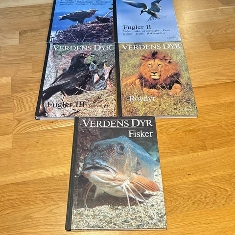 Dette er 12 bind i Cappelens storverk - Verdens Dyr. Bøkene er svært godt behandlet, og de fremstår som helt nye. Serien selges samlet. Jeg har tidligere forsøkt (uten hell) å selge bøkene enkeltvis for 50 kroner pr bok, men nå selges serien samlet for 300 kroner. Det betyr 25 kroner pr bok. Kjøper betaler porto. Her er listen: