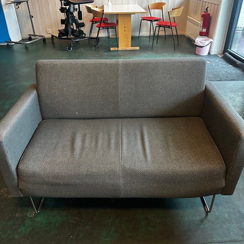 Grå sofa med sjeselong på høyre side gis bort fordi den passser ikke inn i nye stuen lenger !