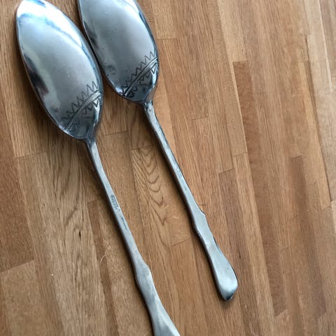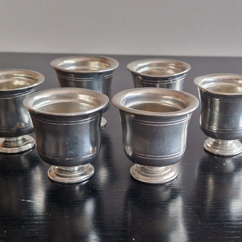 8 hele og fine kopper/krus/seidler i tinn. Stemplet O.K. Løseth Tinn Norway. Det kan forekomme mindre "ilker" eller ujevnheter i koppene (tinn er mykt). Diameter oppe ca. 8 cm, høyde ca. 10 cm. Pris samlet.