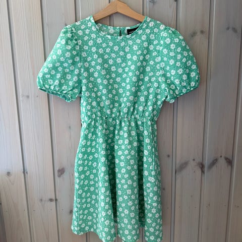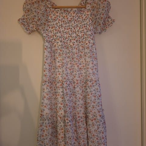 Brukt en gang av et barn. Fin kjole med lett stoff. Er noe stor i str så passer også 146.