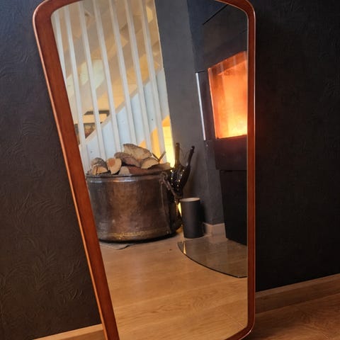 Teak speil i veldig god stand. Selve speilet har noen «skjolder», men ikke særlig fremtredende.