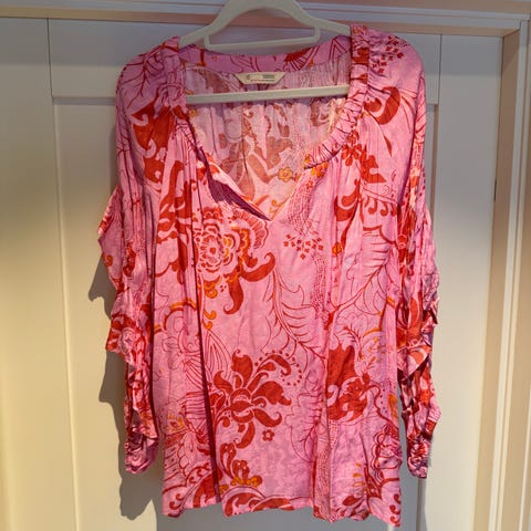 Meget pent brukt skjørt fra Odd Molly I str 2 (tilsvarer medium/large) selges. 50% lyocell 50% Modal. Stoffet er glatt og faller veldig pent. Det er 105 cm langt. Strikk og knytebånd i livet. Når jeg strekker linningen maks måler den 49cm tvers over (altså nesten en meter rundt). Knytebåndet har skjell og perler i enden. Fantastisk flott mønster i stoffet. Bunnfargen er sort, med mønster i rødt, rosa, hvitt, rust og beige.