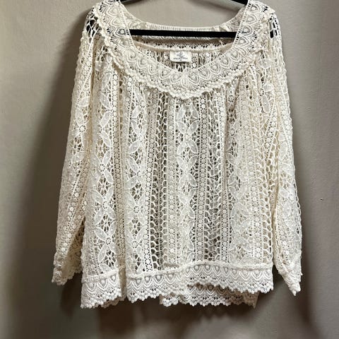 Blusegenser med rund hals og lange ermer. Blondestoff i naturfarge. Grå topp innenfor i bolen. Ermene er gjennombrutt.