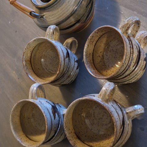 Dette er en lite brukt te- kanne som er laget av Stavanger flint trur eg. Veldig solid og god, tar en god liter med vann.