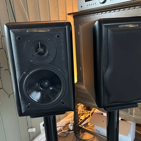 Høyttalerene er tatt godt vare på, aldri spilt på skadelige volumer. Dessverre har de fått noen lette riper i seg som kan synes i dagslys, men ikke i mørkere rom. Det går sikkert an å få gjort noe med dette, men jeg har ikke satt meg inn i det. (Ripene har kommet fra katten vår som i starten absolutt måtte bort og lene seg oppover de.)