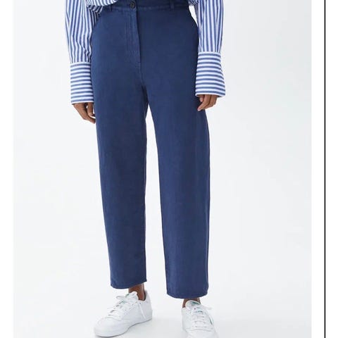 Pent brukte slacks fra Arket i bomull, med elastan. Beige. Bred strikk i linningen. Komfortabel passform med litt sleng nederst på buksebeina. Strl 40 og normal i størrelsen vil jeg si.