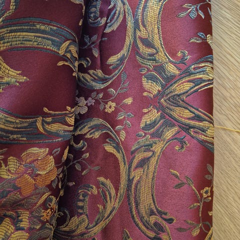 Helt nydelige gardiner som jeg egentlig hadde tenkt å spare på men siden vi har flyttet så passer de ikke inn med fargen her . Og disse er altfor vakre til å ligge pakket vekk i et skap. Så om du leter etter noe virkelig vakkert så har du sjangsen her 💕 de er ikke så høye men ganske brede . De har ikke vanlig oppheng da disse ble hengt opp på en annen måte i tidligere tider ✨ så jeg har bare laget noen midlertidige hemper for å kunne henge de opp 😄 jeg har kun 2 vidunderlige lengder igjen nå og den ene har jeg brukt som sengeteppe på dobbeltseng da de er så brede . Kan absolutt brukes når man lager bunader / festdrakter og liknende da stoffet er solid og er ikke falmet etter alle disse årene 💕 kom gjerne med bud men ingen skambud . Selges for 4000kr pr lengde 🌸 kan sendes med post nord privat for 129 kr 🌻
