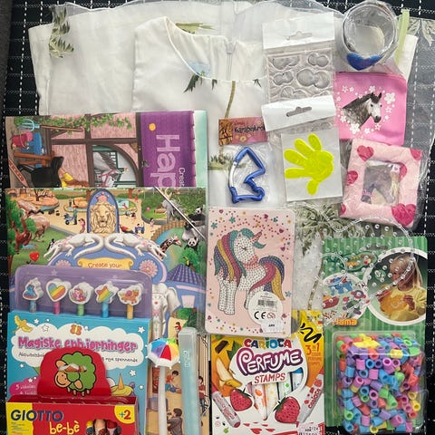 Den inneholder 2 brett med maling- pyntelapper/ klistremerker- kost- spatel .