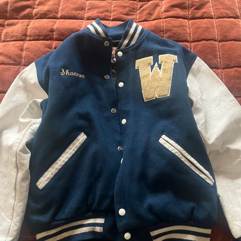 Svart college jakke / bomberjakke med Ull og 100% ekte skinn. Dette er en av de dyrere jakkene jeg har kjøpt hos h&m. Dessverre blitt for liten for meg. Størrelsen er 48 og sitter ca. som en Small