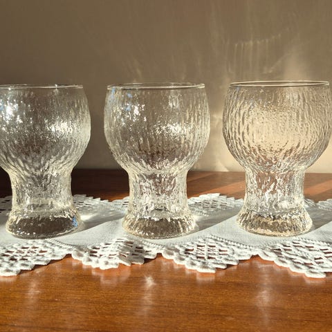 Flotte retro ølkrus x2 fra det anerkjente britiske glassverkstedet Ravenhead. Disse er fra 1970-tallet og i Siesta-mønsteret designet av A.H. Williamson på 1970-tallet. Den har en bark-lignende overflatetekstur og ligner på isglassteksturene som var populære på den tiden. Dette er veldig tunge teksturerte glasskrus med et stilig håndtak. 2 stk selges samlet.