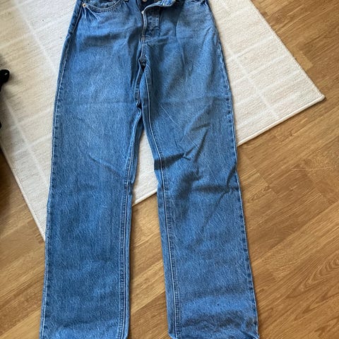 Har ett lite hull på beinet. Den e high waist og har straight bein. Alltid vært ein litt fada svart men har blitt litt lysere i vask. Fargen komme best fram på bilde nr 4. Kjøpt på Carlings
