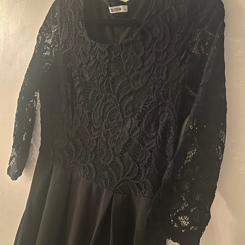 Lårkort sort blondekjole med lange ermer. Str. M, passer som en 40. Perfekt til julebord eller nyttårsfest!