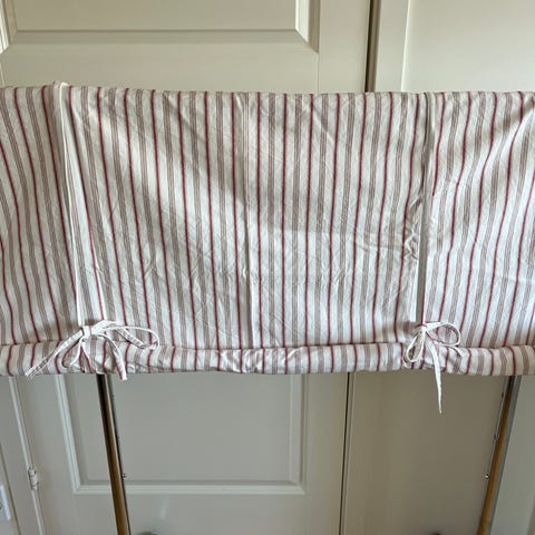 Åtte gardinlengder kjøpt på Kid. Har hengt på hytte og pga vindusoppheng og takhøyde der, ble gardinbåndene avklipt. Søm oppe og nede. Ganske tykt vevet stoff. Mål på gardinene er 1.95 høyde og 1.40 bredde. Selges samlet for 250,-.