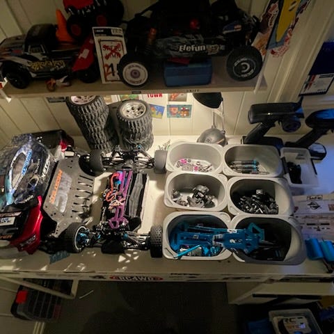 Her finnes flere komplette biler ,et hav av deler,dekk,felger,karosserier,vinger,børsteløse motorer,ESC,dekaler Lipobatterier(Saddle packs)osv.osv.osv.