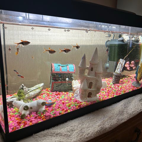 150 liters aquastabil med bakgrunn og poshastativ og 130-150 liter trur det er juwel . Med drage stener, masse falske planter. Varmekolbe. Luftpumpe med 2 utblåsere. Samt stor terramax extern pumpe. Plus masse annet pynt. Fisk : 3 store (ca 15-18 cm) ryggfinne maller, 1 stor (ca 15 cm) Jack Dempsey, 10 + Ancistrus, andre vi lider, juli åler pluss masse annet blandet. Alt sammen samlet inn for 2500kr