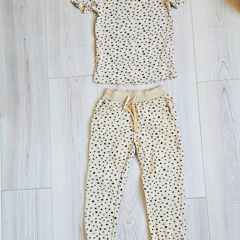 Superflott sett, oppleves som normal i størrelsen. Behagelig lett stoff og vide bein, litt Palazzo / culotte passform. Er lommer i siden og strikk i midjen.