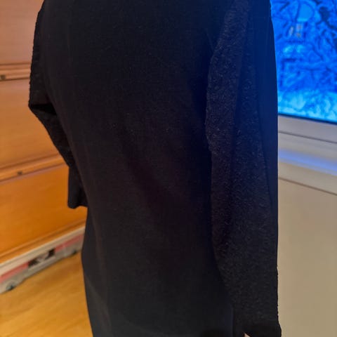 Eksklusiv svart Missoni-kjole i str. 38-40, med åpen rygg og rett fasong. Overdelen er gjennomsiktig, med strikkede ermer og en glitrende nederdel som skaper en stilfull kontrast. Perfekt for spesielle anledninger!