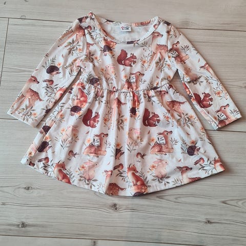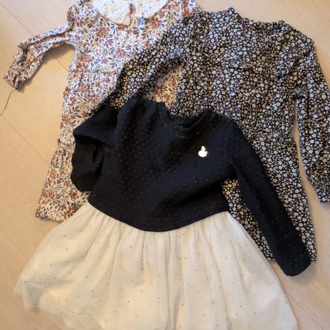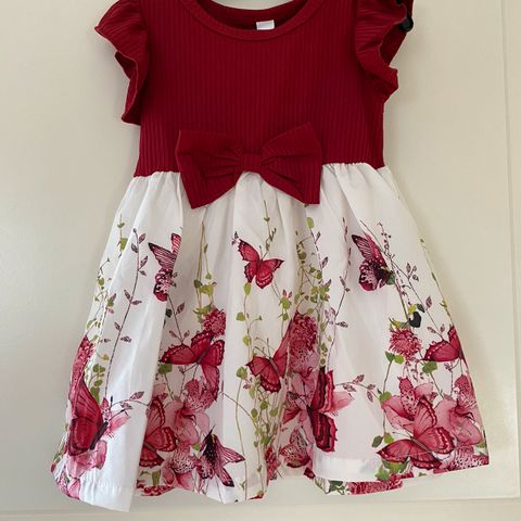Det står ingen str i kjolen, men måler den med andre kjoler og passer da til str. 9-12 mnd. Boleroen står det str. 86 inni. Ser ingen flekker eller skader.