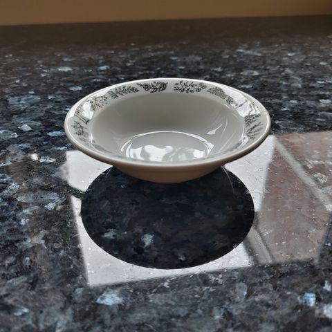 Nydelig fat med blomstermotiv og gullkant , merket Porsgrund 1969. Str 27x 23,5 cm, høyde 3,5 cm. Helt og blankt, Ingen hakk el nagg, men ser noen bittesmå prikker i glasuren som nok er fra produksjonen . Se bilder. Kan sendes mot porto.
